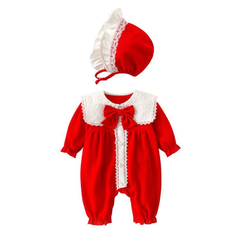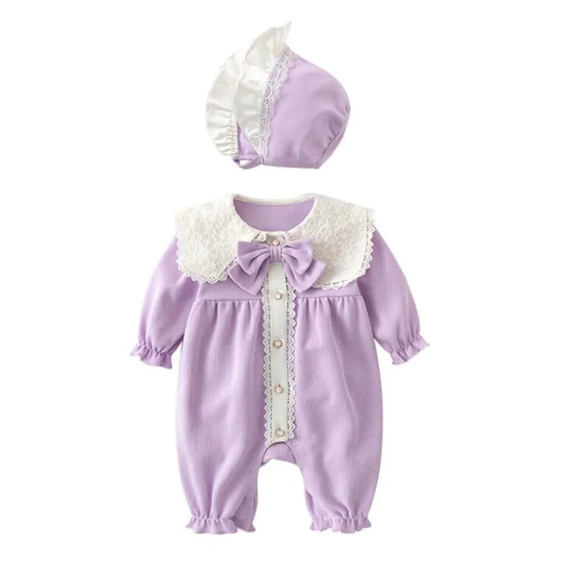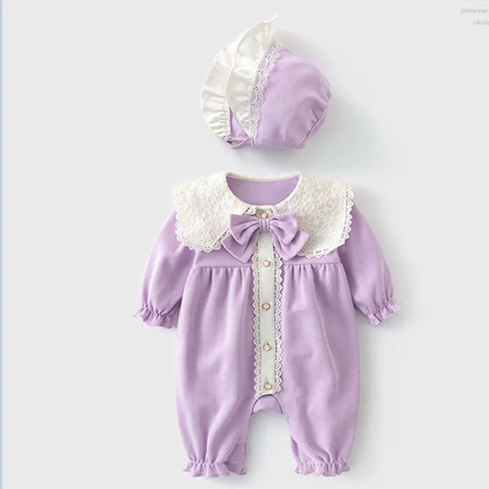 Baby Girl Clothing Autumn Spring Lovely Princess Style Lace Panel Toddler Baby Girl Romper+Hat Infant Baby Girls Jumpsuit