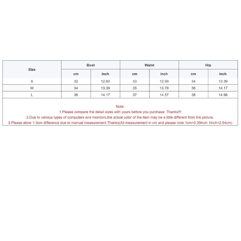 Size:S Bust:32cm(12.60inch) Waist:33cm(12.99inch) Hip:34cm(13.39inch)