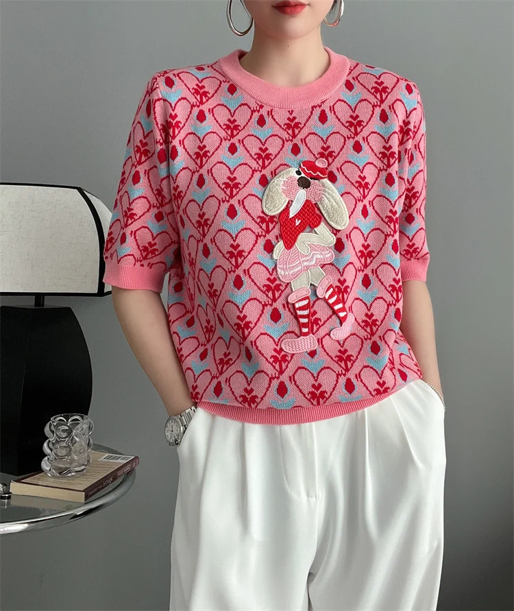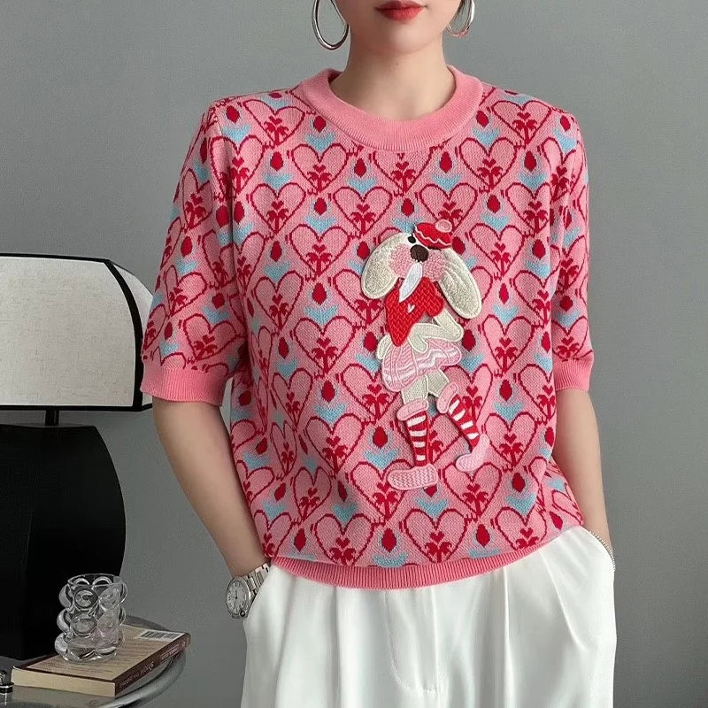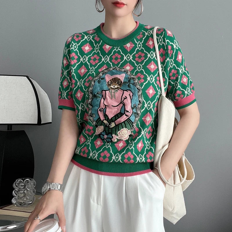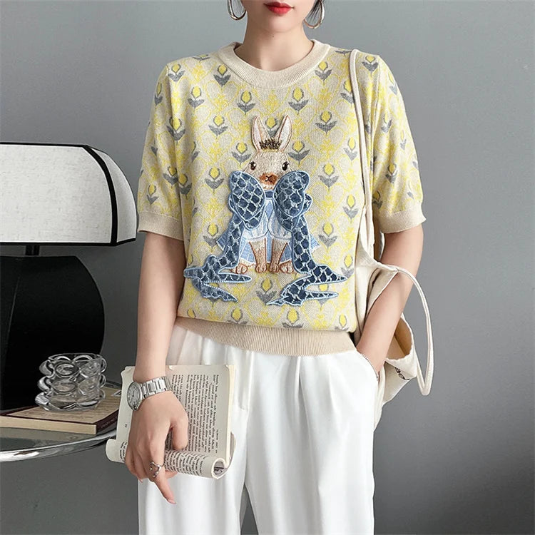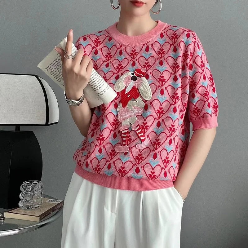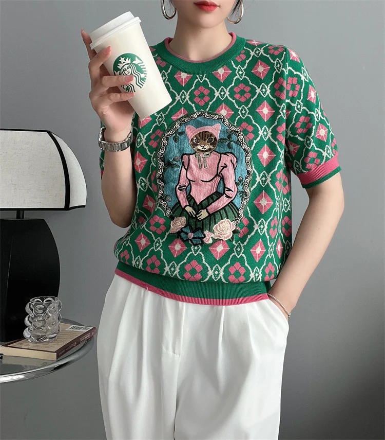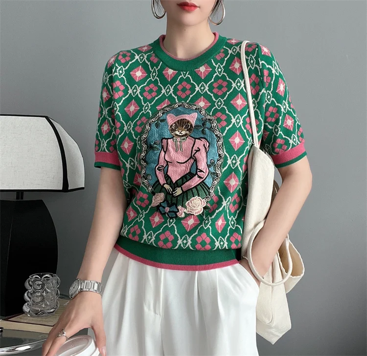 New Summer Women Knitted Sweater European Style Cartoon Pattern Fashion Jacquard Round Neck Short Sleeve Casual Jumpers Knitwear