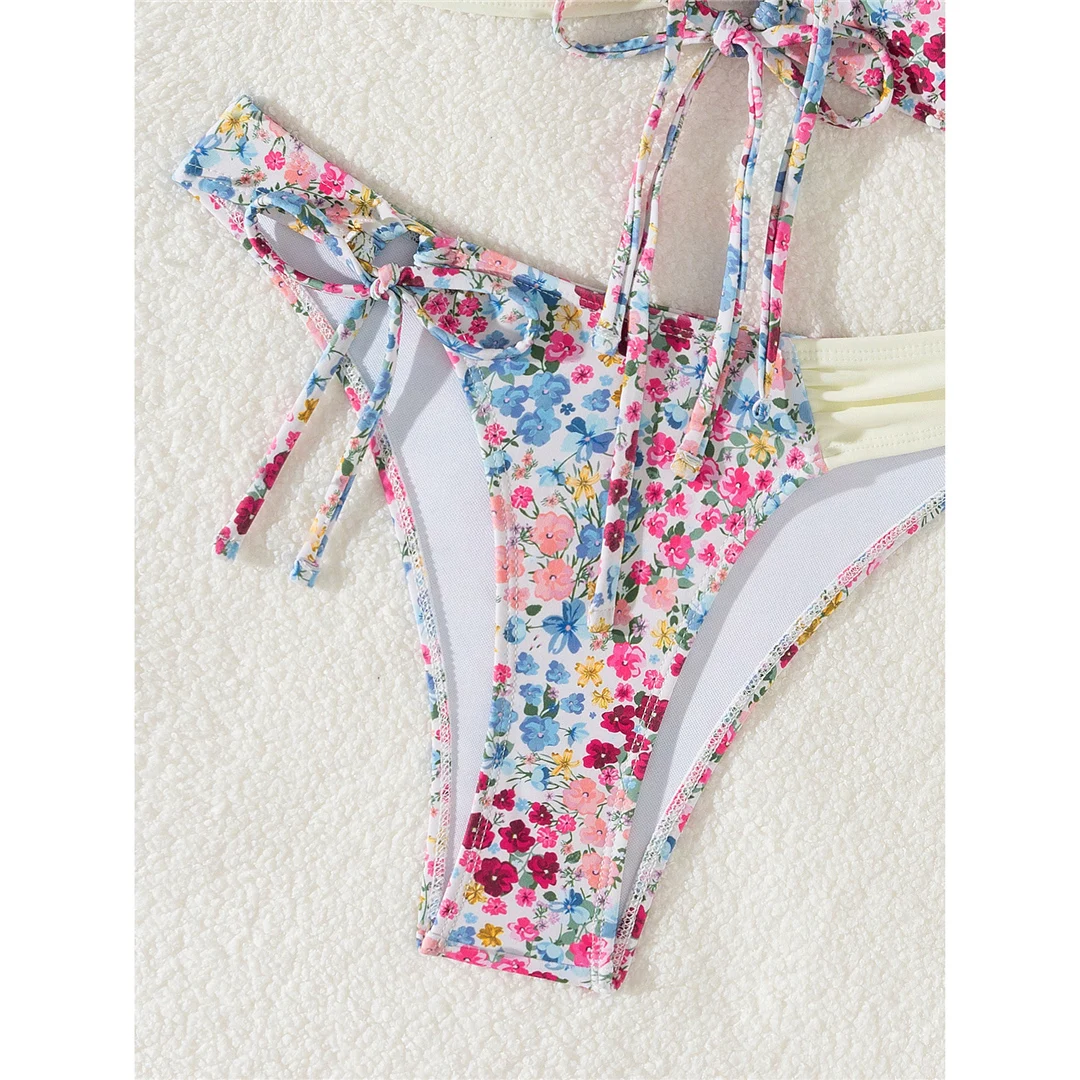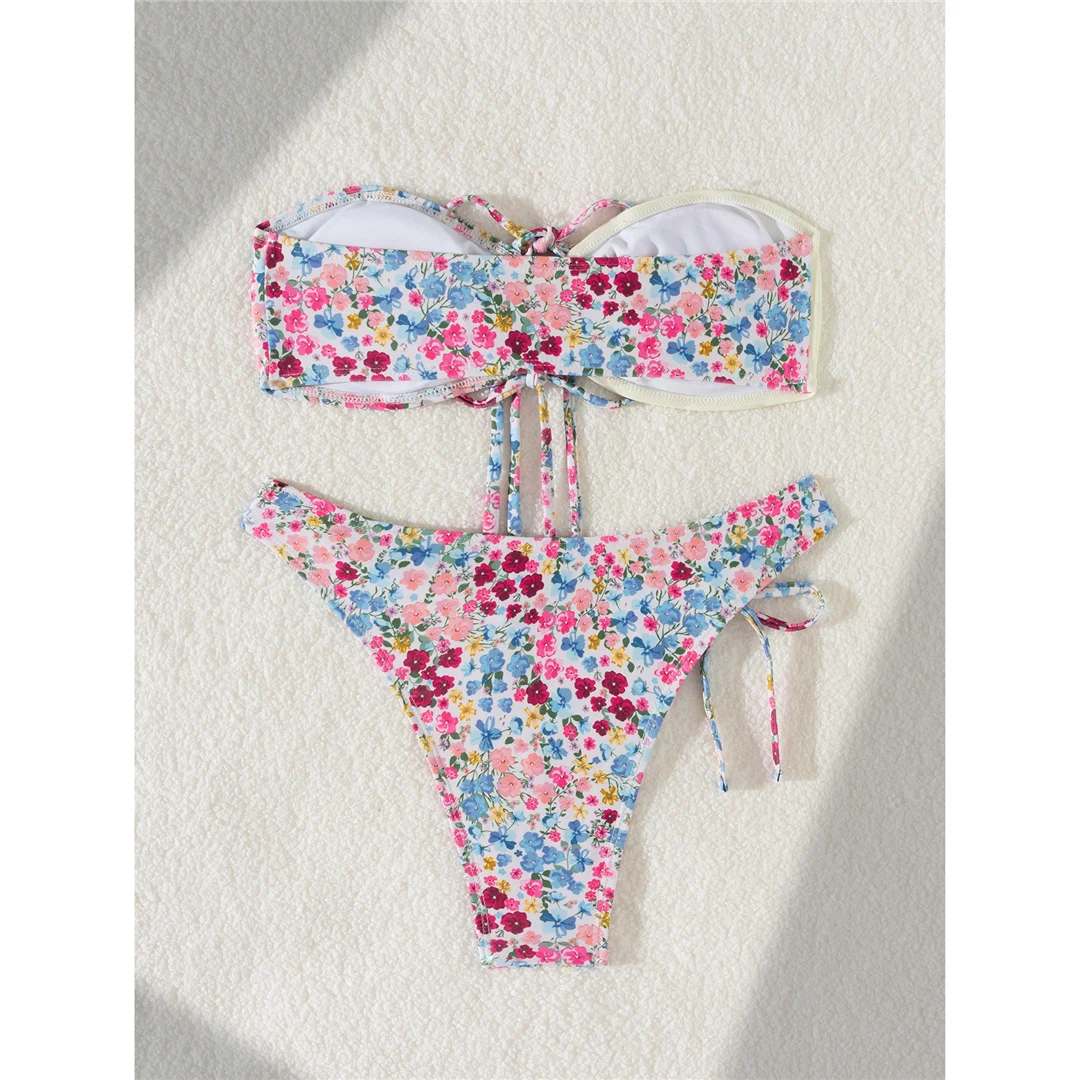Sexy Flowers Printed Bandeau Splicing Bikini Women Swimwear Female Swimsuit Two-pieces Bikini set Bather Bathing Suit Swim V6029